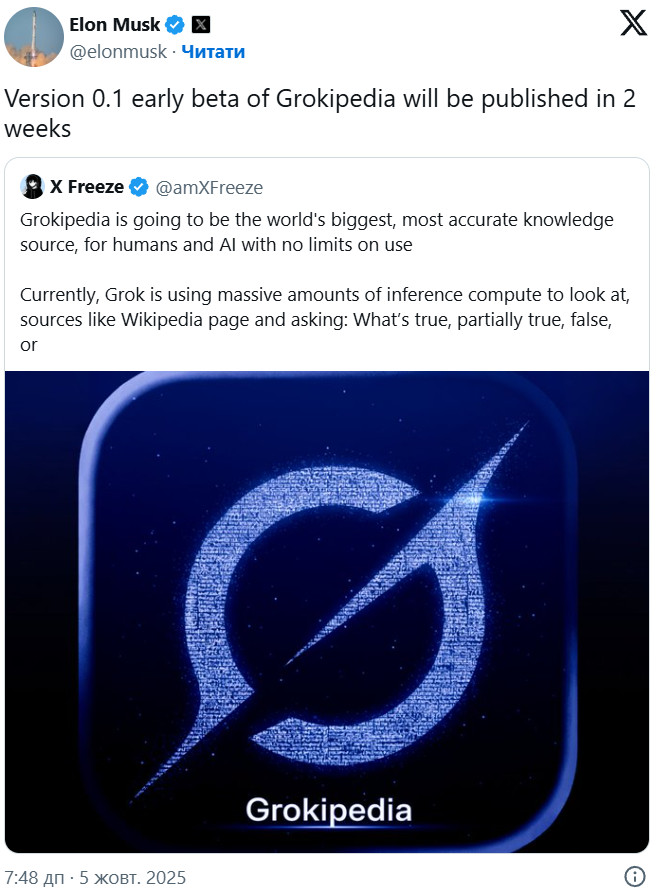 Илон Маск анонсировал портал Грокипедия — альтернативу Википедии на базе ИИ
