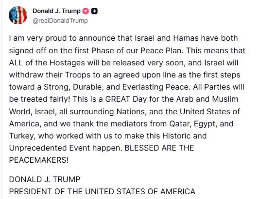 Президент США Дональд Трамп заявил, что Израиль и ХАМАС согласились на первую фазу мирного плана, которая предусматривает освобождение всех заложников и вывод израильских войск к согласованной линии. Об этом он написал в своей соцсети Truth Social.