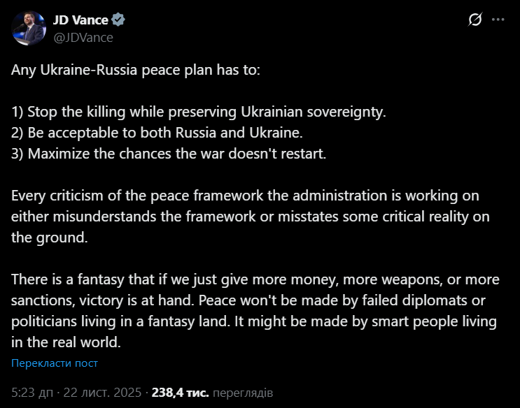 Вице-президент США Вэнс назвал три условия «любого» мирного плана между Украиной и РФ