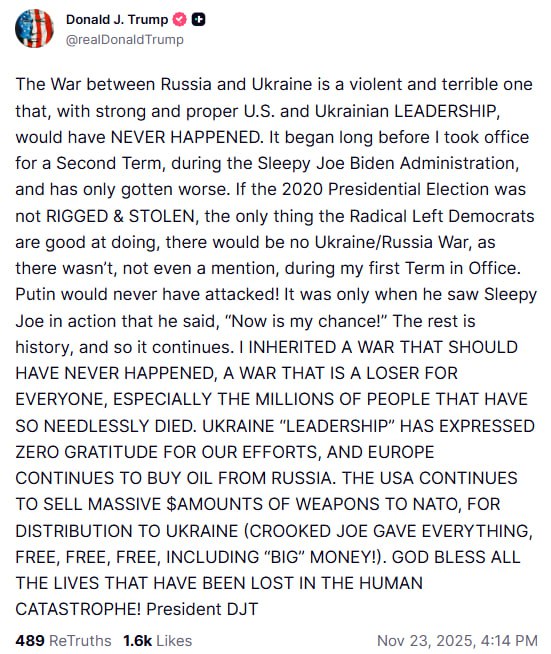 «Руководство Украины не выразило никакой благодарности за наши усилия, а Европа продолжает покупать нефть в России. США ПРОДОЛЖАЮТ ПРОДАВАТЬ НАТО ОГРОМНЫЕ КОЛИЧЕСТВА ОРУЖИЯ ДЛЯ РАСПРЕДЕЛЕНИЯ В УКРАИНЕ (КРИВЫЙ ДЖО ДАЛ ВСЕ, БЕСПЛАТНО, БЕСПЛАТНО, БЕСПЛАТНО, ВКЛЮЧАЯ «БОЛЬШИЕ» ДЕНЬГИ!). БОЖЕ БЛАГОСЛОВЕНИЕ ВСЕМ ЖИЗНЯМ, КОТОРЫЕ БЫЛИ ПОТЕРЯНЫ В ЭТОЙ ЧЕЛОВЕЧЕСКОЙ КАТАСТРОФЕ!», – сказал Трамп.