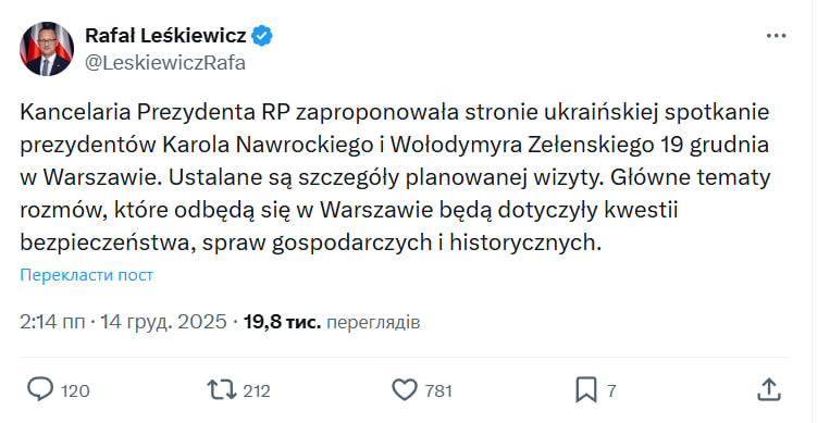 «Канцелярия Президента Республики Польша предложила встретиться между президентами Каролем Навроцким и Владимиром Зеленским в Варшаве 19 декабря», — сообщил пресс-секретарь.