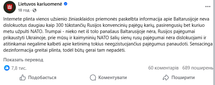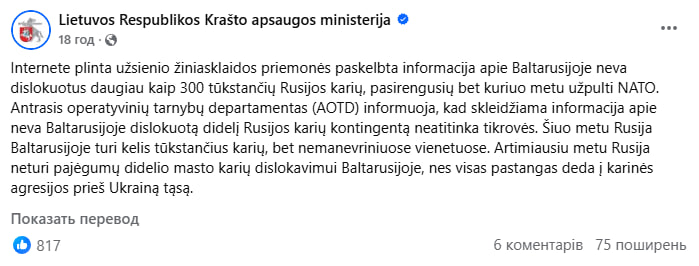 «Это подтверждают также официальные заявления армии и разведки Литвы. По данным литовских оборонных ведомств, в Беларуси в настоящее время находится лишь несколько тысяч военнослужащих РФ, а не сотни тысяч, как утверждается в сообщениях СМИ», – добавили в ЦПД СНБО.