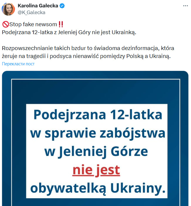 Она подчеркнула, что подозреваемая 12-летняя девочка из Еленя-Гуры не является гражданкой Украины, а распространение подобных заявлений является сознательной дезинформацией.