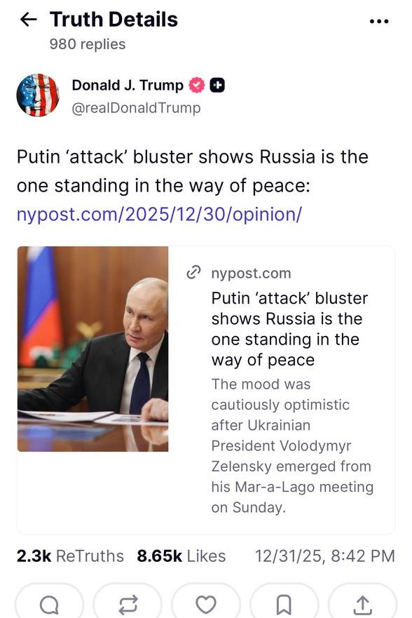 На фоне этих выводов президент США Дональд Трамп публично преуменьшил российские заявления о якобы атаке. Он распространил в соцсети Truth Social материал New York Post с заголовком, в котором утверждается, что заявления Кремля являются блефом и что именно Россия остается препятствием для мира.