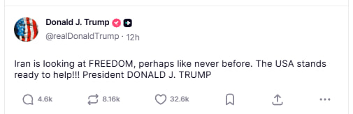 «Иран стремится к свободе, возможно, как никогда раньше. США готовы помочь!!!», — отметил Трамп, не конкретизировав, в чем именно может заключаться такая поддержка.
