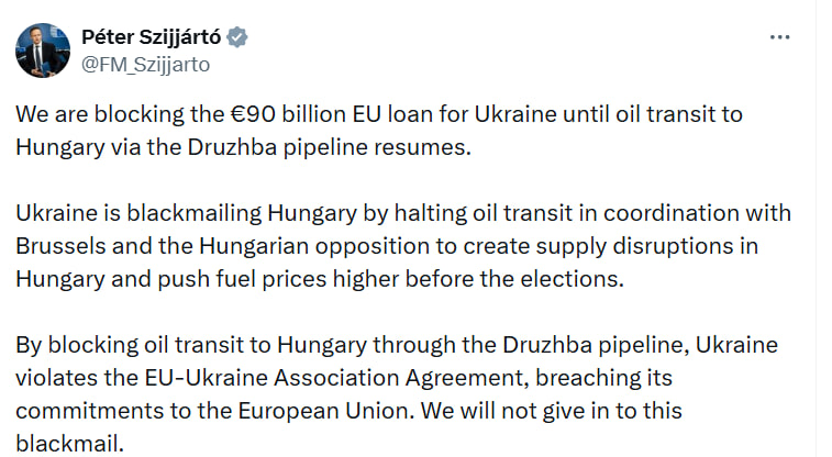В соцсети X он обвинил Украину в якобы шантаже, утверждая, что Киев в координации с Брюсселем и венгерской оппозицией остановил транзит нефти, чтобы создать перебои с поставками и повысить цены на топливо накануне выборов.