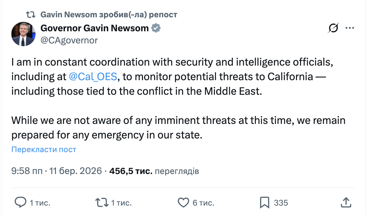 «Я постоянно координирую свои действия с представителями служб безопасности и разведки, в частности с Управлением по чрезвычайным ситуациям Калифорнии, чтобы отслеживать потенциальные угрозы для Калифорнии, в частности те, что связаны с войной на Ближнем Востоке», – заявил Ньюсом в своем аккаунте в соцсетях.