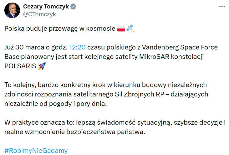 Министр национальной обороны Польши Цезарий Томчик сообщил в соцсети X, что запуск спутника MikroSAR из группировки POLSARI состоится 30 марта в 12:20 по польскому времени с базы ВВС США Ванденберг.