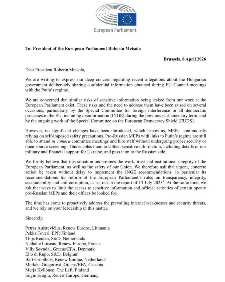 На фоне ситуации группа депутатов Европейского парламента обратилась с письмом к президентке институции Роберте Мецоле. В обращении они предупреждают о рисках утечки чувствительной информации и указывают на уязвимости в системе безопасности парламента.