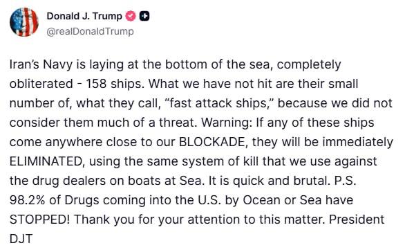 «Военно-морские силы Ирана лежат на дне моря, полностью уничтожены — 158 кораблей. Мы не поразили лишь их небольшое количество так называемых «скоростных ударных кораблей», поскольку не считали их серьезной угрозой. Предупреждение: если хоть один из этих кораблей приблизится к нашей БЛОКАДЕ, он будет немедленно уничтожен…», — заявил Трамп.