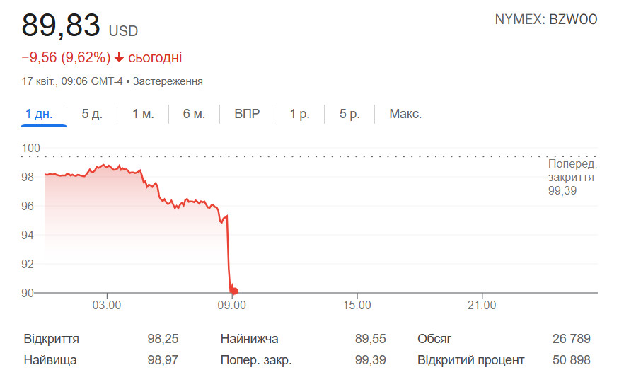 На 16:17 нефть Brent снизилась в цене на 9,56%, достигнув $89,83 за баррель.