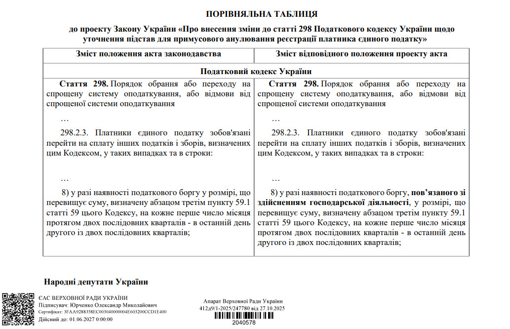 Авторы инициативы отмечают, что подпунктом 8 подпункта 298.2.3 пункта 298.2 статьи 298 Налогового кодекса Украины установлено, что плательщики единого налога обязаны перейти на уплату других налогов и сборов, определенных этим Кодексом, в случае наличия налогового долга в размере, превышающем сумму, определенную абзацем третьим пункта 59.1 статьи 59 данного Кодекса, на каждое первое число месяца в течение двух последовательных кварталов — в последний день второго из двух последовательных кварталов.
