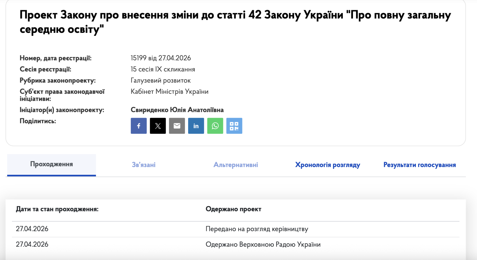 Кабинет Министров зарегистрировал в Верховной Раде законопроект № 15199, который касается изменений в сфере общего среднего образования.
