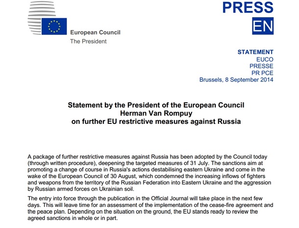 Напомним, 3 сентября Еврокомиссия разработала новые санкции против России, которые должны были быть приняты Советом ЕС сегодня. Также решение о необходимости новых санкции в отношении России приняли накануне на саммите НАТО в Уэльсе.
