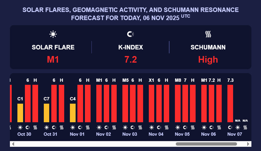 В четверг, 6 ноября, прогнозируется высокая солнечная активность с К-индексом 7,2 (красный уровень), что соответствует сильным магнитным бурям, которые могут влиять на здоровье и самочувствие. В пятницу, 7 ноября, ожидается К-индекс 7,3 (также красный уровень), что указывает на сильную магнитную бурю. Люди с метеочувствительностью могут испытывать головную боль, усталость или раздражительность.