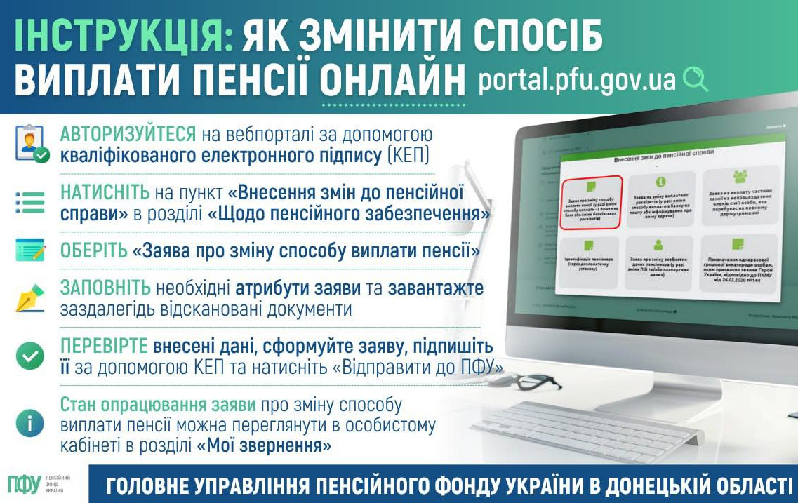 Подать заявление на изменение способа выплаты пенсии можно онлайн — через личный кабинет на веб-портале электронных услуг Пенсионного фонда Украины.