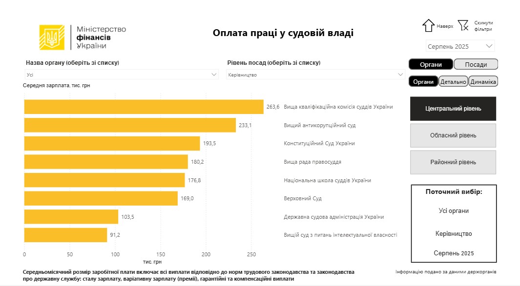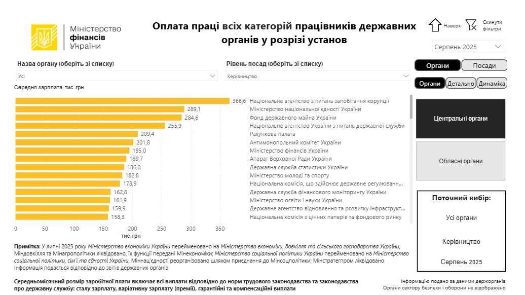 Министерство финансов обновило данные дашборда с размером оплаты труда работников государственных органов в разрезе учреждений, включив туда аналитику за август 2025 года. Как всегда, в этом перечне отсутствуют такие центральные органы исполнительной власти, как Национальное антикоррупционное бюро (НАБУ) и Бюро экономической безопасности (БЭБ).