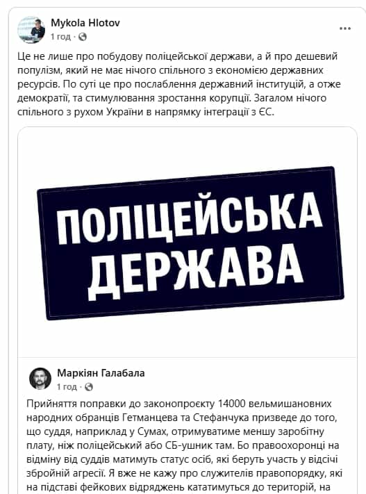 «Принятие поправки к законопроекту 14000 многоуважаемых народных избранников Гетманцева и Стефанчука приведет к тому, что судья, например, в Сумах, будет получать меньшую заработную плату, чем полицейский или СБ-шник там. Потому что правоохранители, в отличие от судей, будут иметь статус лиц, участвующих в отражении вооруженной агрессии. Я уже не говорю о служителях правопорядка, которые на основании фейковых командировок будут кататься на территории, где ведутся боевые действия, для оформления соответствующего статуса. Искусство ощипывать гуся так, чтобы он не кричал», – написал Маркиян Галабала в соцсетях, комментируя новость «Судебно-юридической газеты».