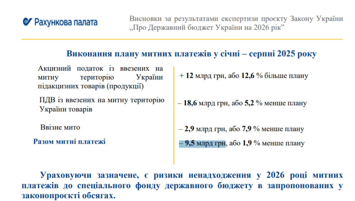Так, она отметила, «состояние выполнения в январе – августе 2025 года плановых показателей поступления таможенных платежей в общий фонд государственного бюджета увеличивает риск их невыполнения в 2025 году и усиливает его на 2026 год».