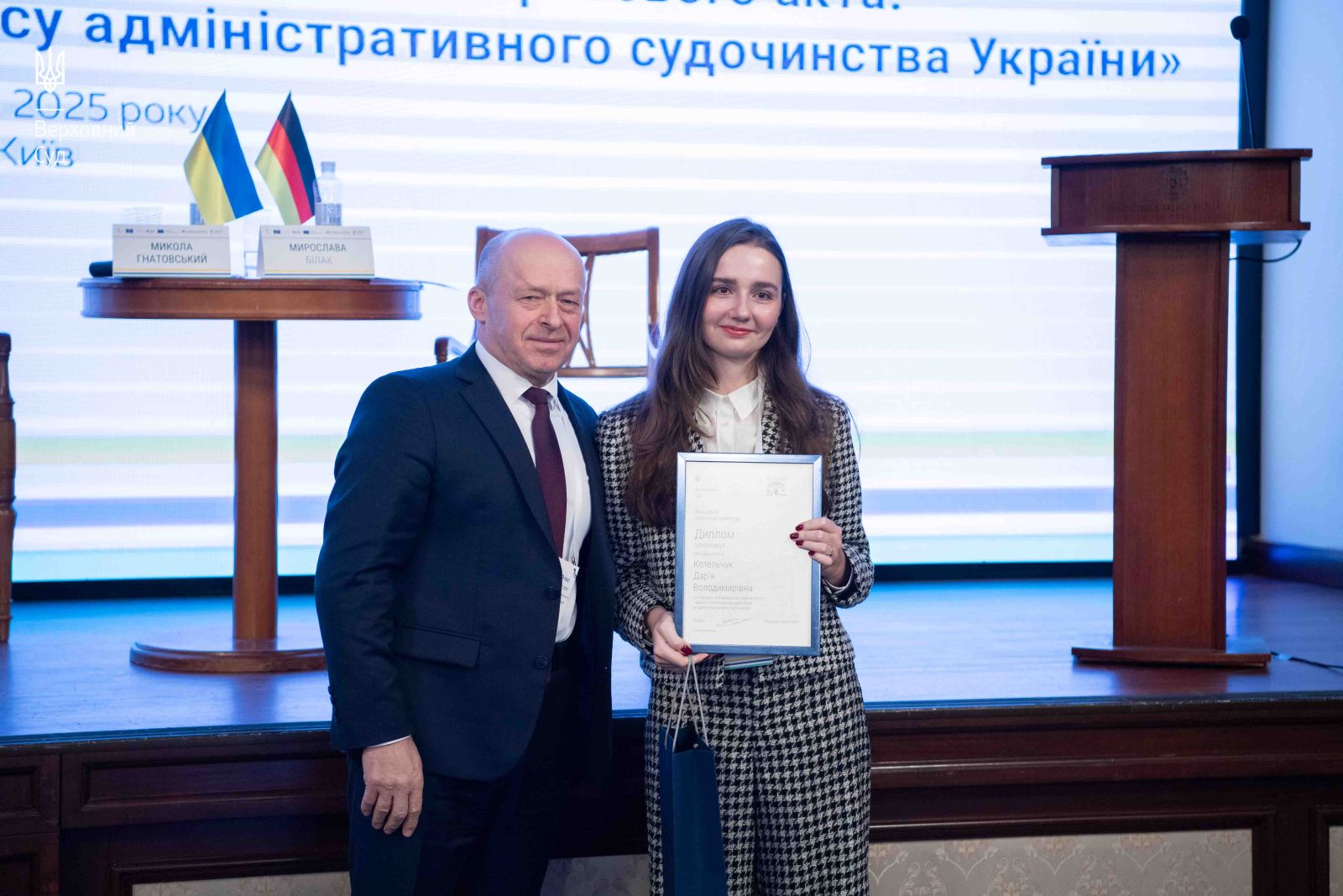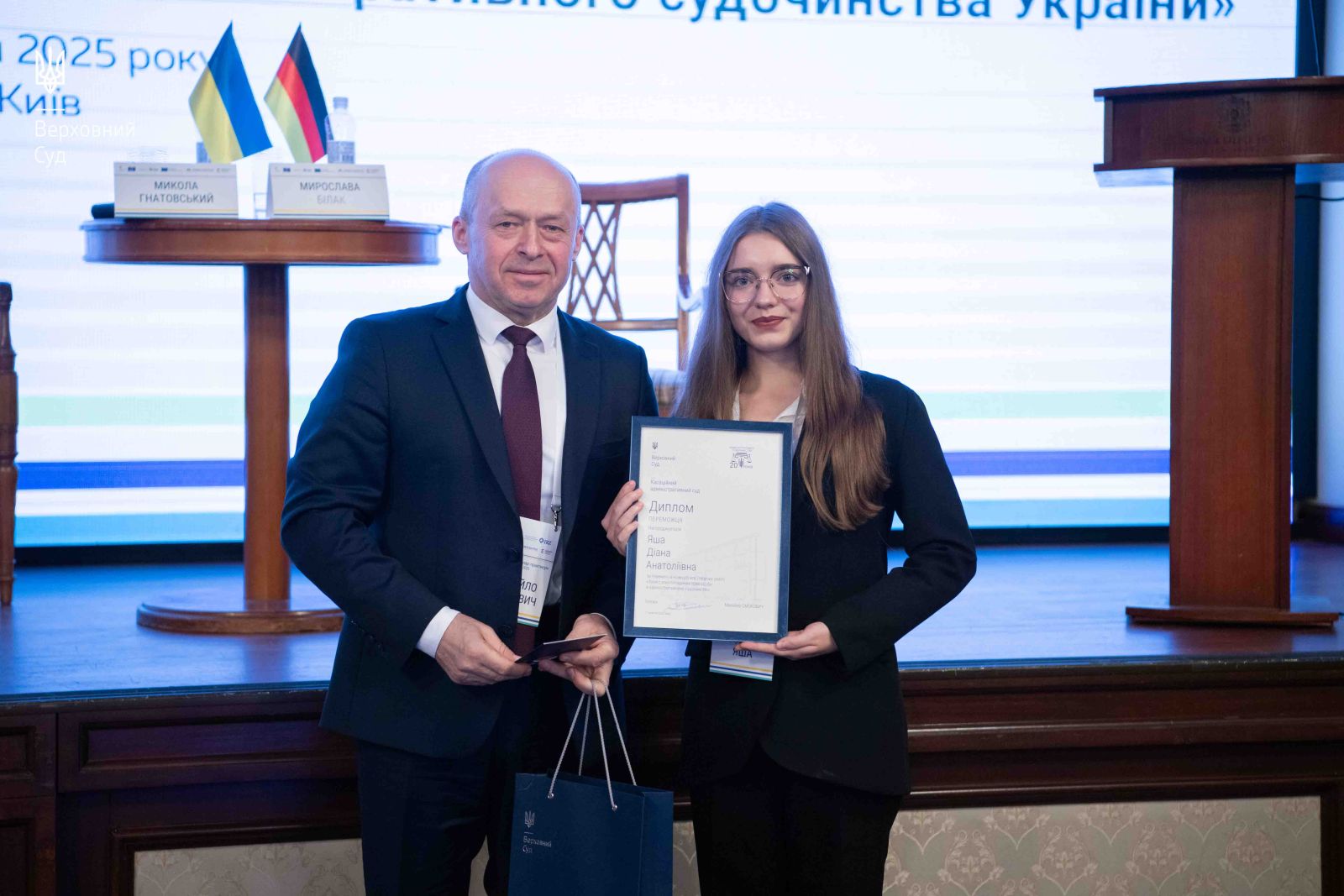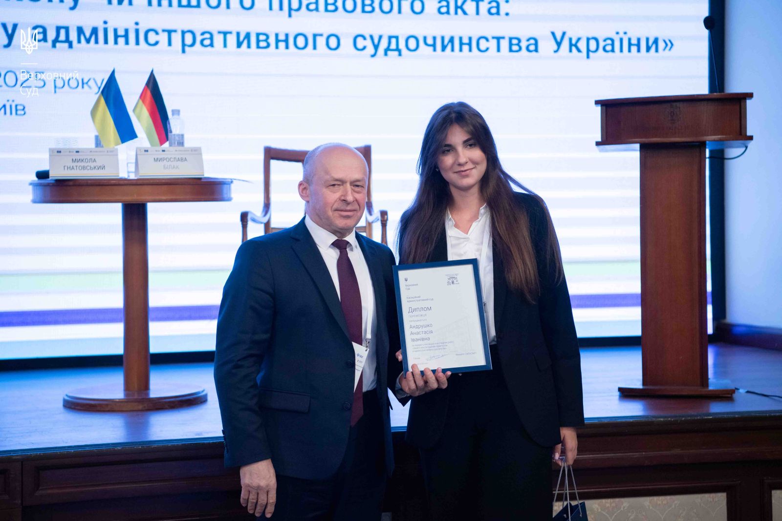 В завершение первой части мероприятия состоялось награждение победителей творческого конкурса эссе на тему «Защита конституционных прав личности в административном судопроизводстве» среди соискателей высшего юридического образования. Напомним, что конкурс проведен по случаю 20-й годовщины Кодекса административного судопроизводства Украины и с целью популяризации деятельности административных судов среди студенческой молодежи. Победителями конкурса эссе стали студенты Анастасия Андрушко (Национальный университет «Львовская политехника»), Виктория Вакулинская (Национальный университет «Острожская академия»), Елизавета Головко (Государственный торгово-экономический университет), Дарья Котельчук (Национальная академия внутренних дел) и Диана Яша (Национальный университет «Киево-Могилянская академия»).