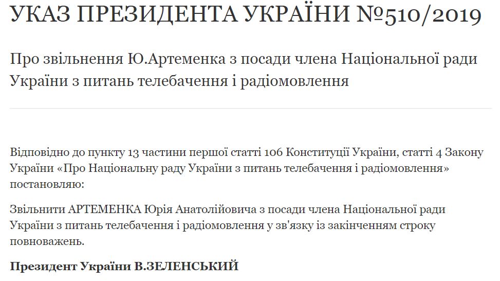 Звільнити Артеменка Юрія Анатолійовича з посади члена Національної ради України з питань телебачення і радіомовлення у зв'язку із закінченням строку повноважень», — йдеться у тексті постанови.
