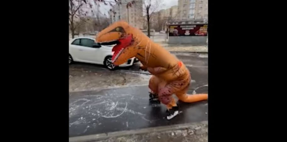 В пятницу, 11 декабря, в Киеве один из местных жителей в костюме динозавра катался по ледяном тротуаре на коньках. Видео опубликовал пользователь Facebook Олег Решетняк.