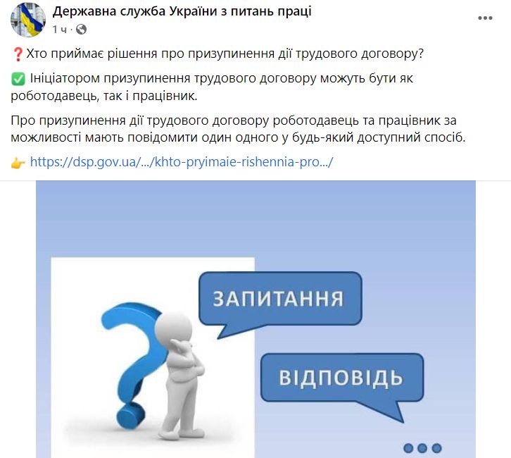 Про призупинення дії трудового договору роботодавець та працівник за можливості мають повідомити один одного у будь-який доступний спосіб», — сказано у повідомленні.