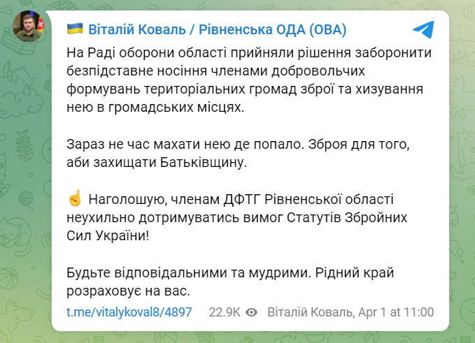 «На Раді оборони області прийняли рішення заборонити безпідставне носіння членами добровольчих формувань територіальних громад зброї та хизування нею в громадських місцях.