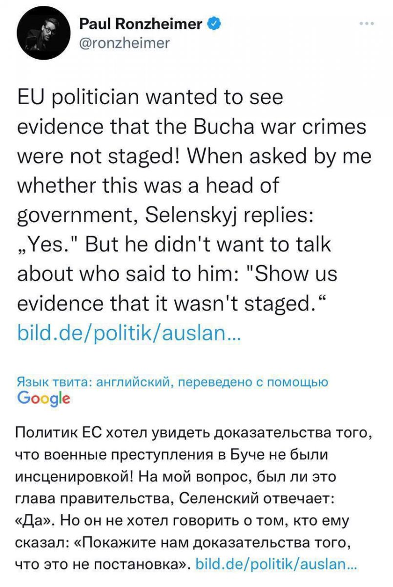 Так, на вопрос о худшем, что он слышал за последние дни, Зеленский ответил, что это было желание одного из ведущих политиков ЕС получить доказательства того, что «резня в Буче» не была инсценировкой.