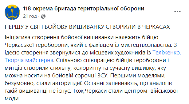 У Черкасах створили першу у світі бойову вишиванку. Ініціатором став боєць 118 окремої бригади тероборони із Черкас – фахівець із мистецтвознавства.