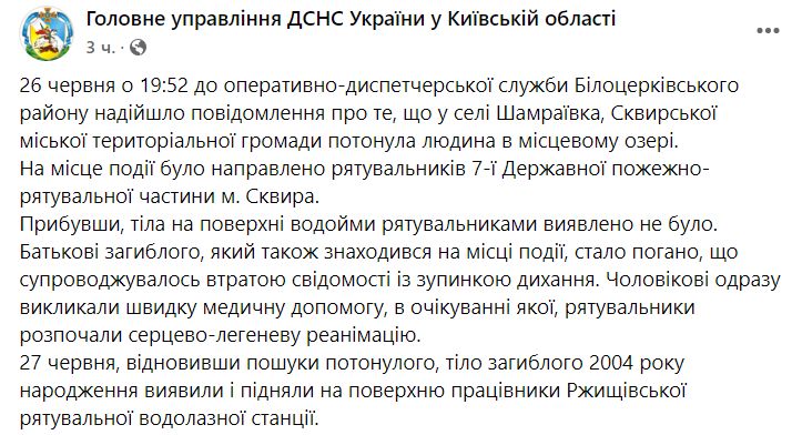 В воскресенье, 26 июня, в селе Шамраевка Киевской области утонул парень, передает пресс-служба ГСЧС.