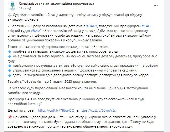 2 марта 2023 года по ходатайству детективов НАБУ, согласованному прокурором САП, следственный судья ВАКС избрал меру пресечения в виде 2,684 млн грн залога адвокату - соучастнику в подстрекательстве лица к предоставлению неправомерной выгоды антикоррупционным органам за избежание наказания в коррупции.