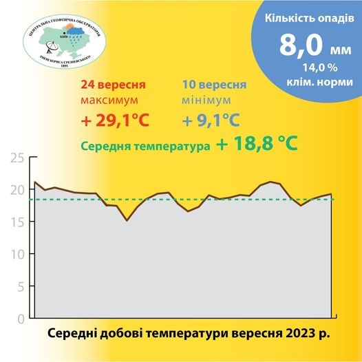 Отмечается, что среднемесячная температура воздуха в сентябре в Киеве равнялась +18,8°С, что на 3,9°С выше климатической нормы.