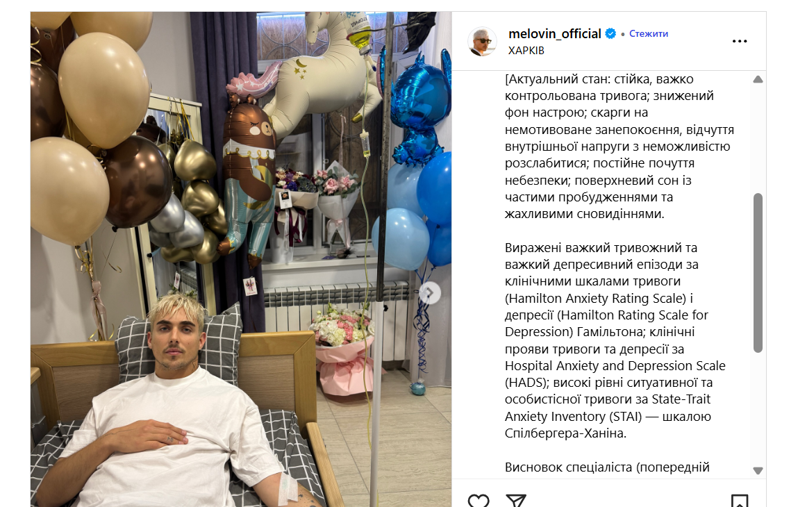 Украинский певец MELOVIN признался, что из-за серьезного ухудшения своего состояния он попал в харьковскую клинику. Артист поделился кадрами из больничной палаты, где находится под капельницей, и рассказал о своем диагнозе.