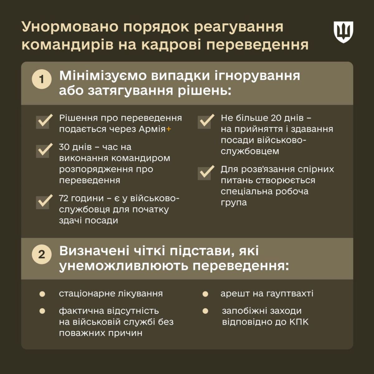 Кабинет Министров утвердил важные решения, регулирующие порядок перевода военнослужащих в другие военные части. Как сообщает Министерство обороны, изменения касаются усовершенствования процедур реагирования командиров на кадровые переводы с целью минимизации случаев затягивания или игнорирования решений.
