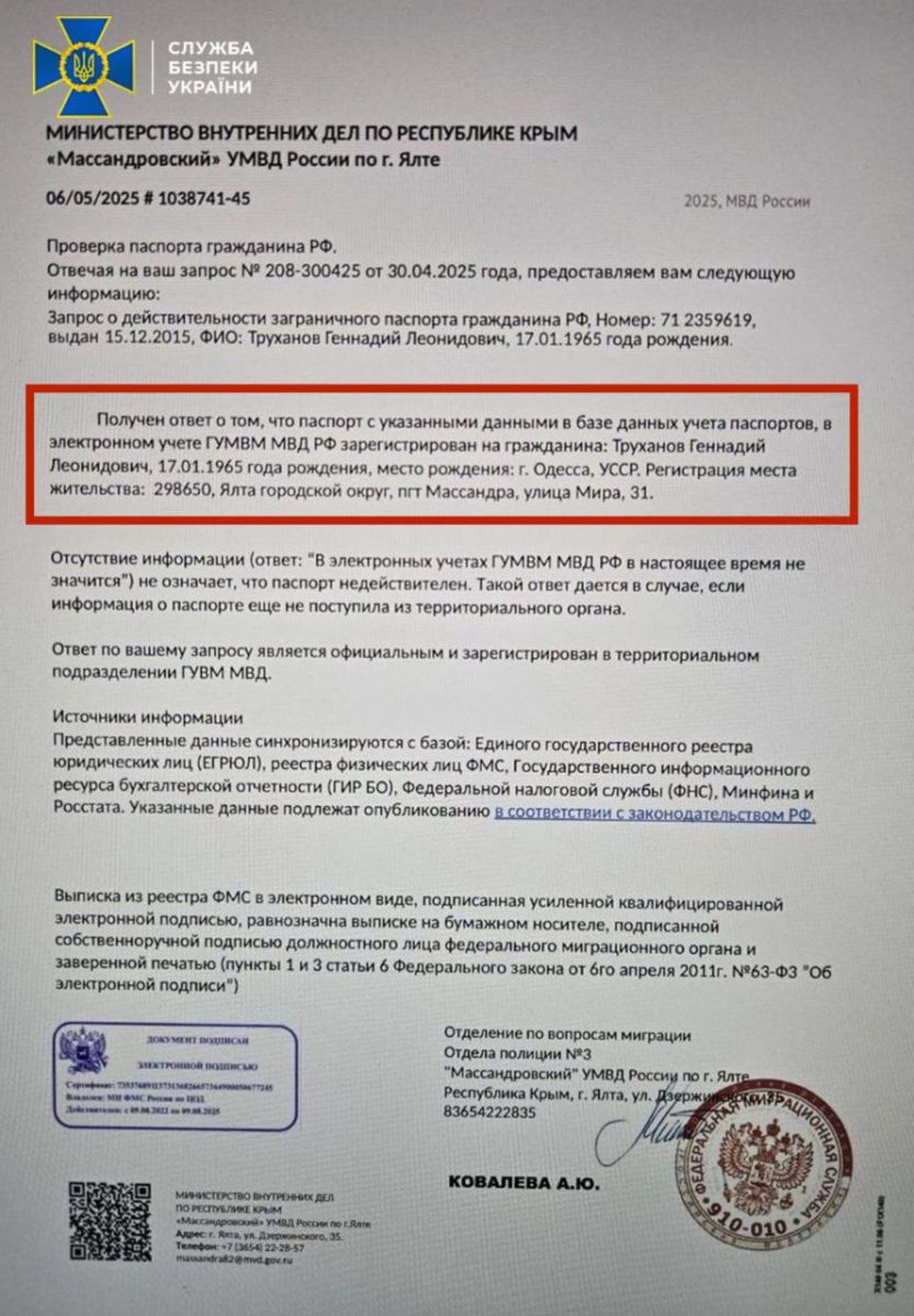 По данным Службы безопасности, нынешний мэр Одессы Геннадий Труханов является гражданином России и имеет действующий загранпаспорт.