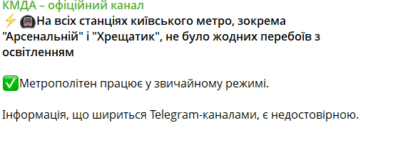 "На всех станциях киевского метро, ​​в том числе "Арсенальной" и "Крещатик", не было никаких перебоев с освещением", - заявили в КГГА.