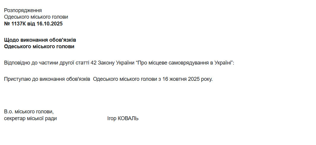 Временно исполняющим обязанности городского головы Одессы стал секретарь городского совета Игорь Коваль. Он заменил на должности Геннадия Труханова, якого Президент Владимир Зеленский лишил гражданства из-за наличия российского паспорта.