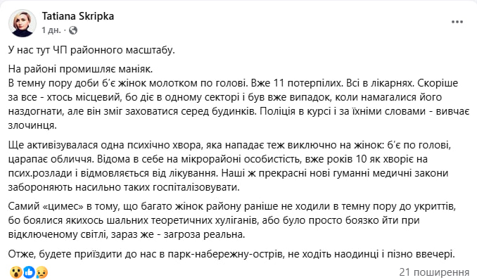 В соцсетях распространяется информация о якобы «маньяке», который в темное время суток нападает на женщин в Оболонском районе Киева и бьет их молотком по голове. Об этом сообщила полиция Киева.