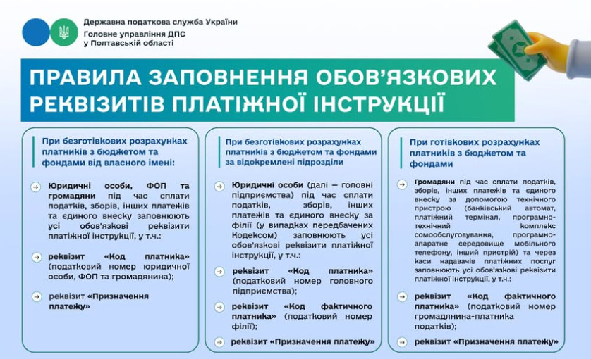 Главное управление ГНС в Полтавской области напомнило о правилах заполнения обязательных реквизитов платежного поручения в соответствии с Постановлением Национального банка Украины от 22.07.2022 № 163 «Об утверждении Инструкции о безналичных расчетах в национальной валюте пользователей платежных услуг» и приказом Министерства финансов Украины от 22.03.2023 № 148 «Об утверждении Порядка заполнения реквизита “Назначение платежа” платежного поручения при уплате (взыскании) налогов, сборов, таможенных и других платежей, единого взноса на общеобязательное государственное социальное страхование, внесении авансовых платежей (предоплаты), денежного залога, а также в случае их возврата».