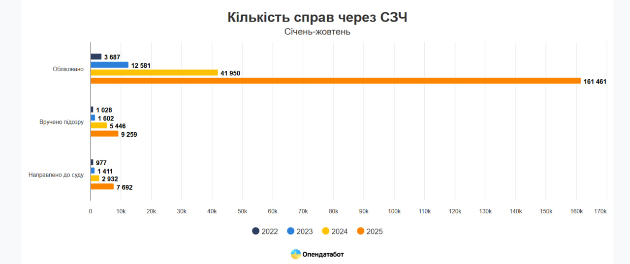 За 10 месяцев 2025 года открыто 161 461 уголовное производство по статье о самовольном оставлении воинской части (СЗЧ, ст. 407 УК). Это в четыре раза больше, чем за аналогичный период 2024 года. В среднем ежемесячно правоохранители фиксируют почти 16 тысяч новых дел о так называемой «самоволке», однако только 5% из них переданы в суд. Об этом сообщает Опендатабот, ссылаясь на данные Генеральной прокуратуры Украины.