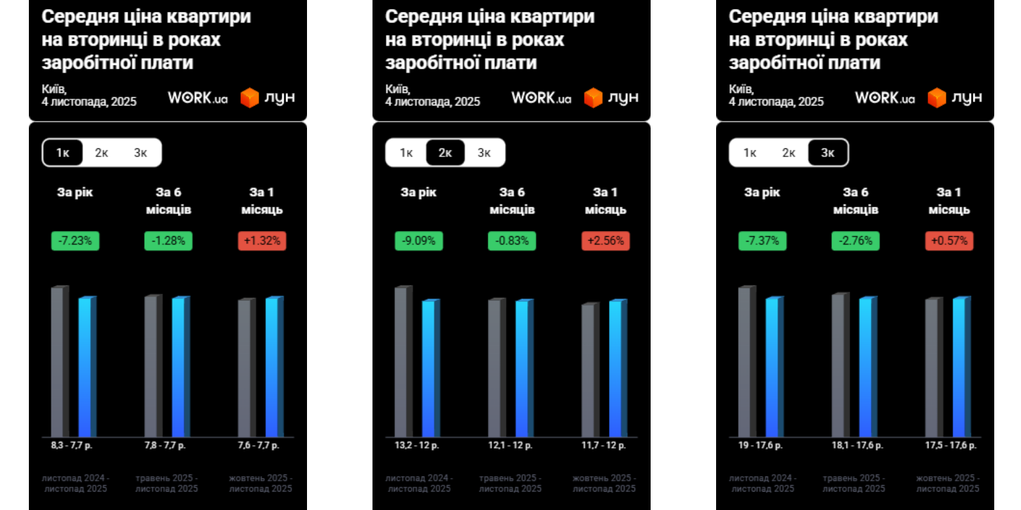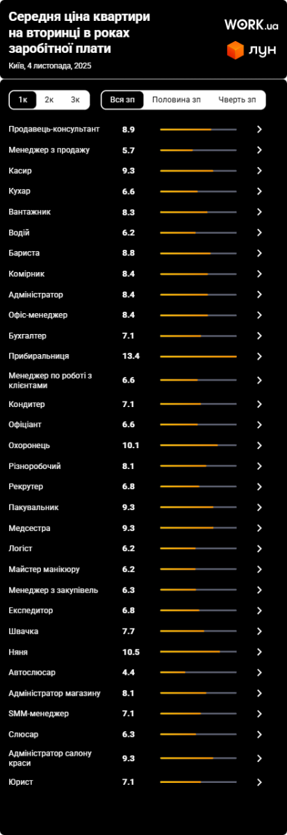 «Абстрактные миллионы гривен мало что говорят о реальной доступности жилья, поэтому мы измеряем стоимость квартиры в годах зарплаты для самых популярных профессий», — объясняет бренд- и бизнес-директор ЛУН Денис Судилковский.