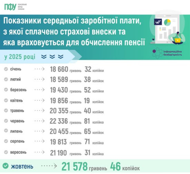«25 ноября 2025 года утвержден показатель средней заработной платы (дохода) в Украине, с которой уплачены страховые взносы и которая в соответствии с Законом Украины „Об общеобязательном государственном пенсионном страховании“ учитывается для расчета пенсии, за октябрь 2025 года. Он составляет 21 578 гривен 46 копеек», — говорится в сообщении.