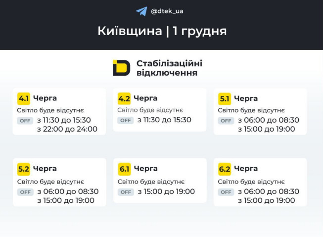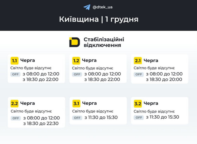 Как будут отключать свет в Киевской области 1 декабря — ДТЭК опубликовал графики