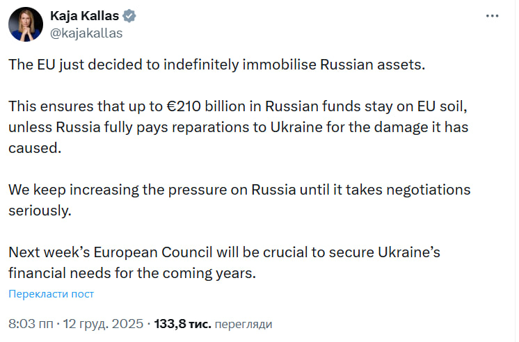 По словам Каллас, это гарантирует сохранение до 210 миллиардов евро российских средств на территории ЕС, пока Россия не выплатит Украине компенсацию за нанесенный ущерб.