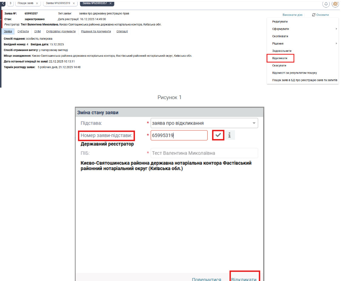 для отзыва заявления необходимо во вкладке «Выполнить действие» отзываемого заявления выбрать операцию «Отозвать» (Рисунок 1), указать номер заявления-основания (Заявления об отзыве заявления), проверить введенный номер на наличие в ГРВП и, в случае успешной проверки, нажав кнопку «Отозвать» (Рисунок 2), перевести заявление в состояние «Отозвано».