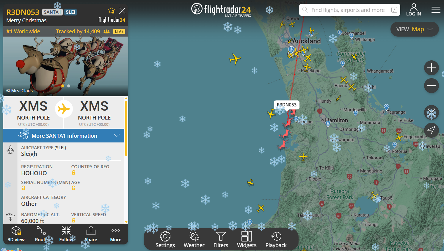 Чтобы увидеть маршрут Санты, достаточно зайти на сайт Flightradar24 и ввести в поиске один из позывных: