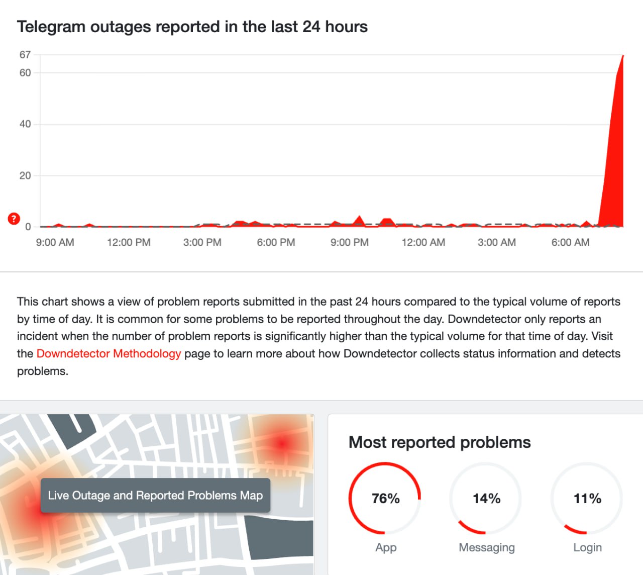 Утром 10 января пользователи Telegram начали массово сообщать о сбоях в работе мессенджера. Информацию о технических проблемах фиксирует сервис Downdetector.