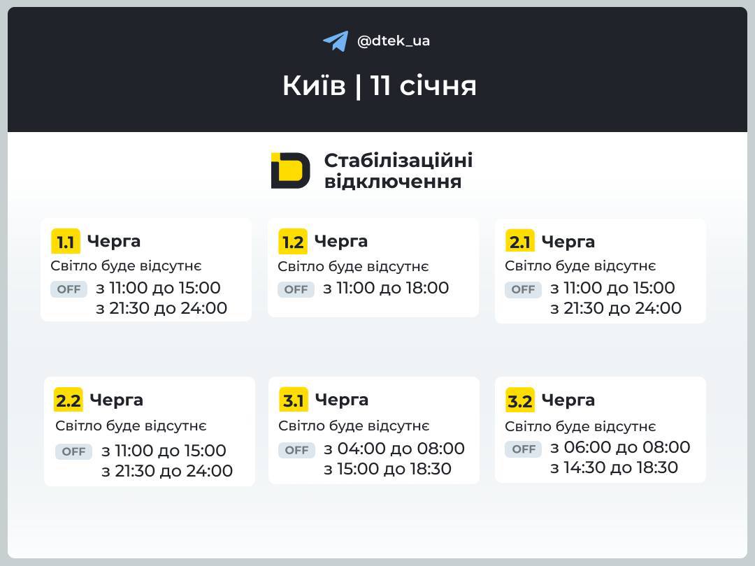 В ДТЕК опубликовали график отключений света на 11 января в столице.