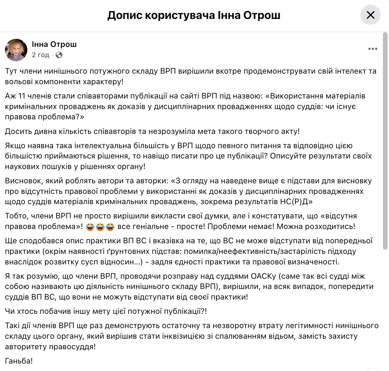 Юрист Инна Отрош публично раскритиковала коллективную публикацию членов Высшего совета правосудия, посвященную использованию материалов уголовных производств в качестве доказательств в дисциплинарных делах в отношении судей. Речь идет о материале под названием «Использование материалов уголовных производств в качестве доказательств в дисциплинарных производствах в отношении судей: существует ли правовая проблема?», размещенном на официальном сайте ВСП. Соавторами публикации стали сразу 11 членов Совета.
